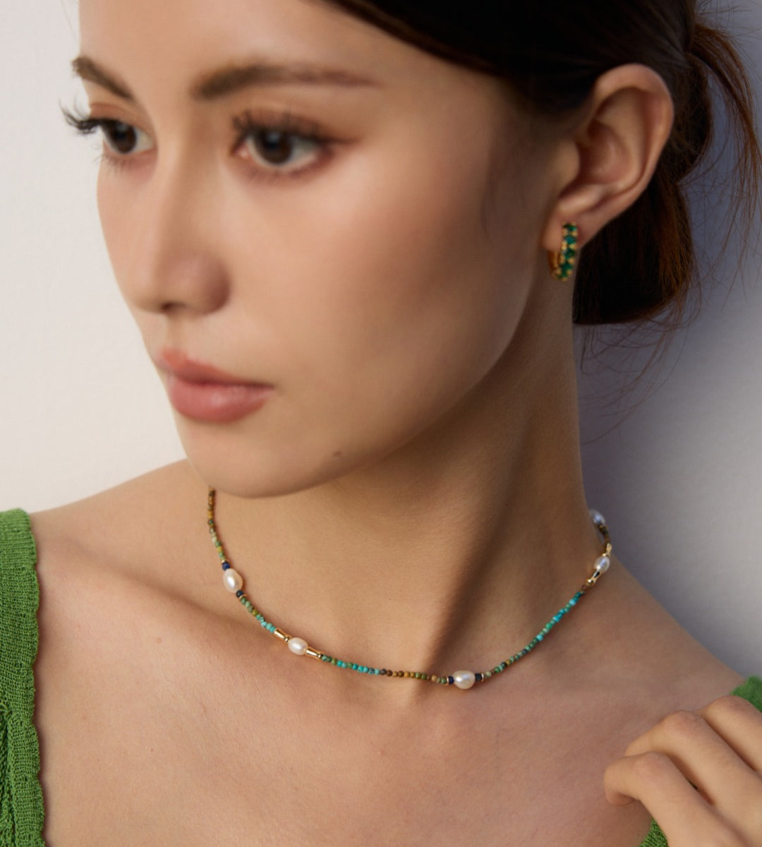Gentle Wave | Bamboo-Inspired Pearl and Green Gemstone Necklace & Bracelet Set D0533-2