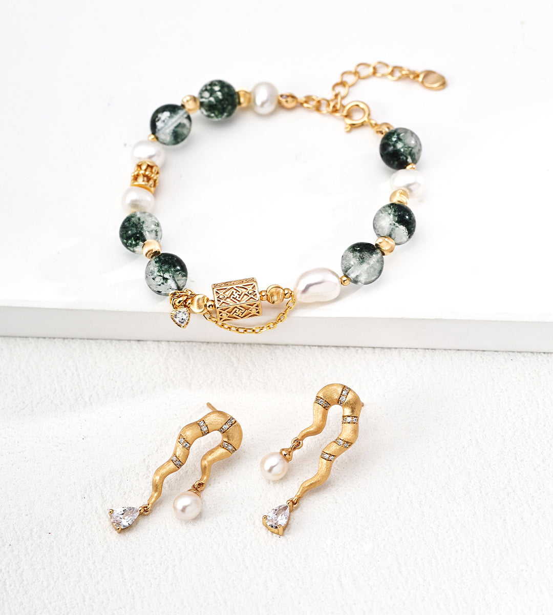 Gentle Wave | Bamboo-Inspired Pearl and Green Gemstone Necklace & Bracelet Set D0533-2