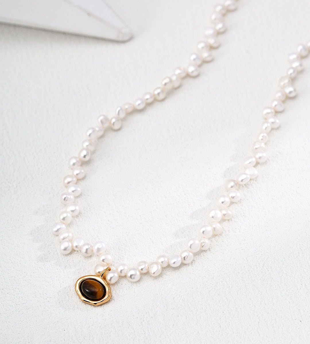 Petrified Wood Tiger's Eye & Pearl Necklace Caramel Macchiato Inspired Jewelry D0683-2