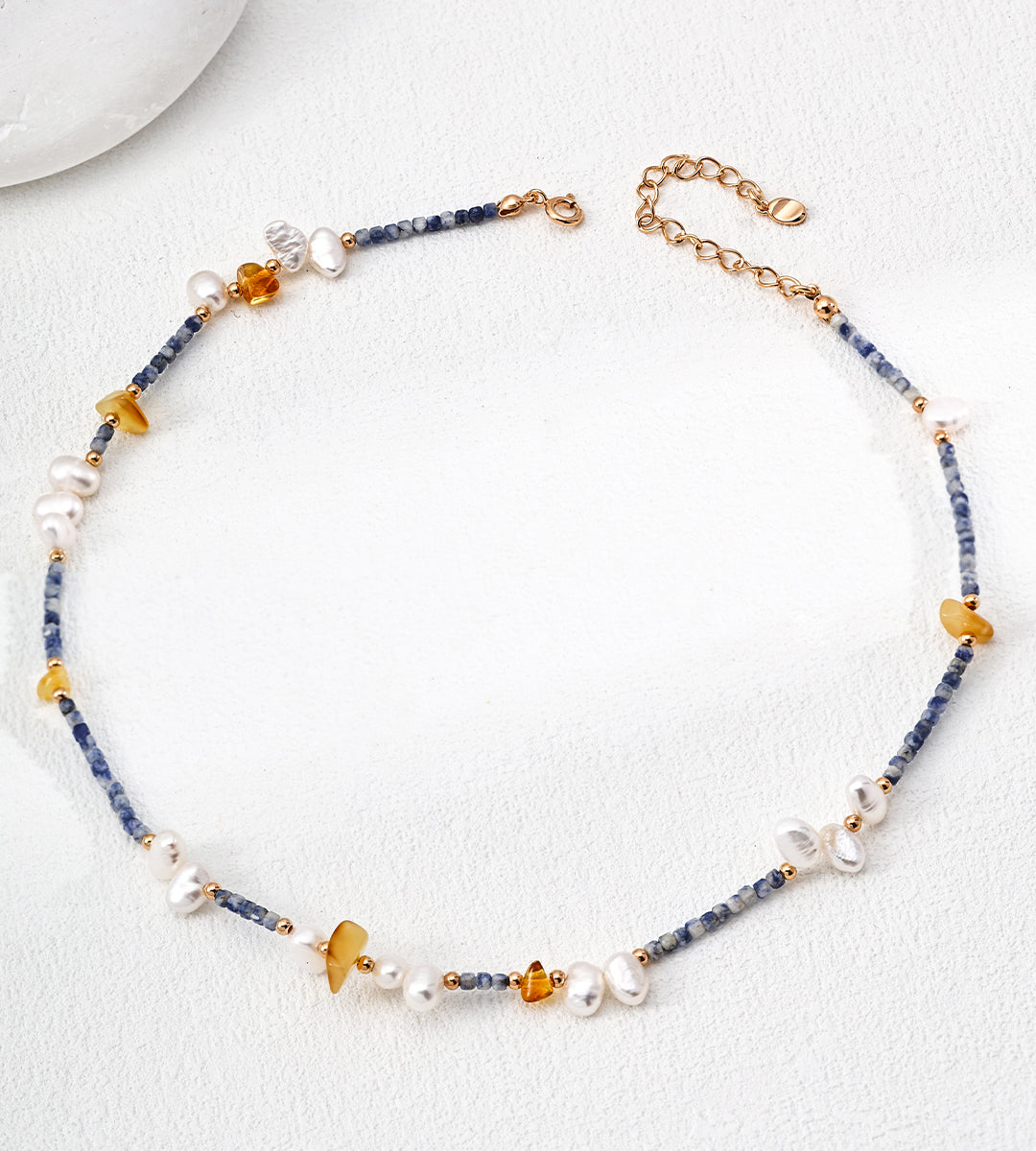 Gentlewaveco Fashion Natural Pearl Blue Spot Stone Beeswax Pendant Necklace D0626-2