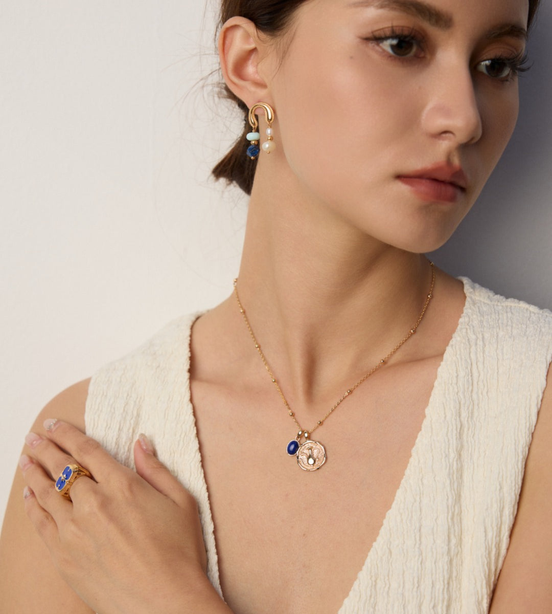 Gentlewaveco Vintage Natural Pearl Lapis Lazuli Turquoise Pendant Necklace D0625