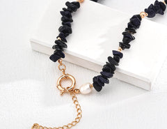 This stunning piece combines the celestial allure of natural blue sandstone with the soft elegance of pearls. The blue sandstone glistens like a starry night sky, while the pearl adds a touch of refinement and warmth. Accented with vintage-inspired gold details and a beautifully crafted clasp, this versatile accessory can be worn both as a necklace or wrapped around the wrist as a double-layered bracelet. Whether worn for everyday elegance or special occasions, this piece will set you apart with its unique style and graceful allure
