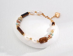 This exquisite bracelet combines the warm, earthy tones of Shoushan stone, the rich depth of tiger's eye, and the natural elegance of freshwater pearls. Each bead is carefully selected to create a harmonious design, accented with subtle gold-tone details for added sophistication. Perfect for adding a touch of natural beauty to any outfit, this bracelet celebrates the artistry of nature with its unique mix of textures and colors. Ideal for both special occasions and everyday wear, it’s a versatile piece that embodies timeless elegance and charm.