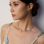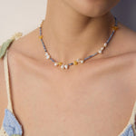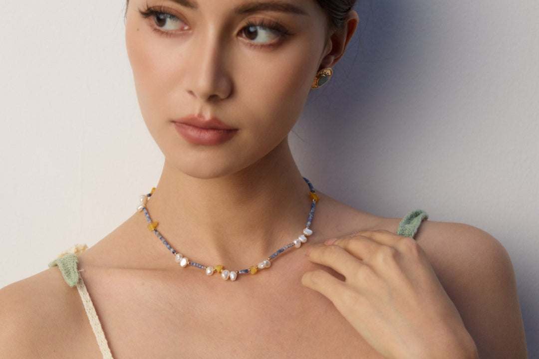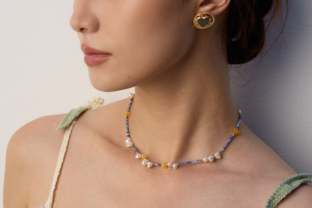 Modern bohemian elegance. This artistic necklace showcases an organic arrangement of luminous pearls, distinctive blue spot stones, and irregular beeswax pieces - creating a wearable work of art that moves with effortless grace.