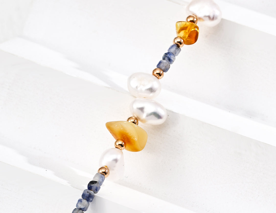 Dimensions: Length: 38cm + 6cm Extender | Stone: 2.5mm | Pearl: 4-7mm | Irregular Beeswax