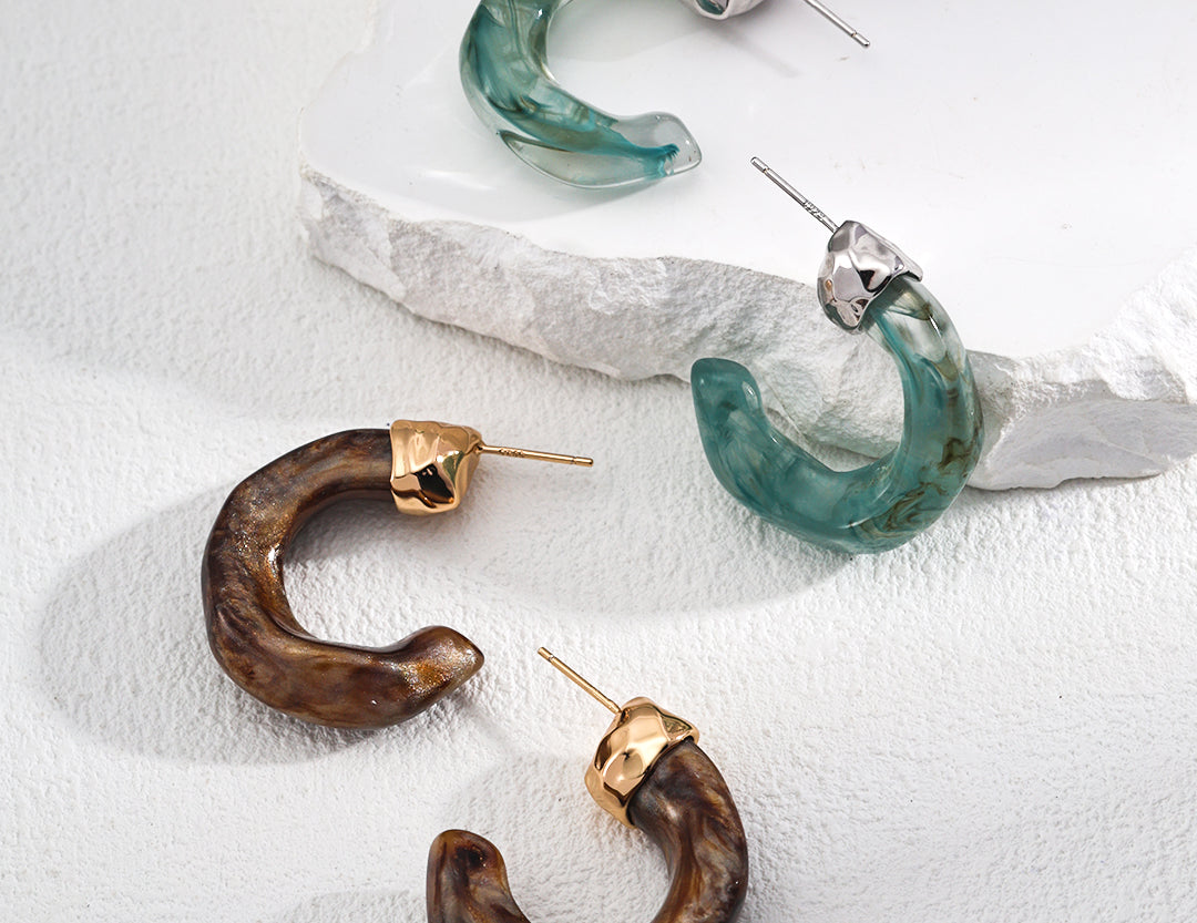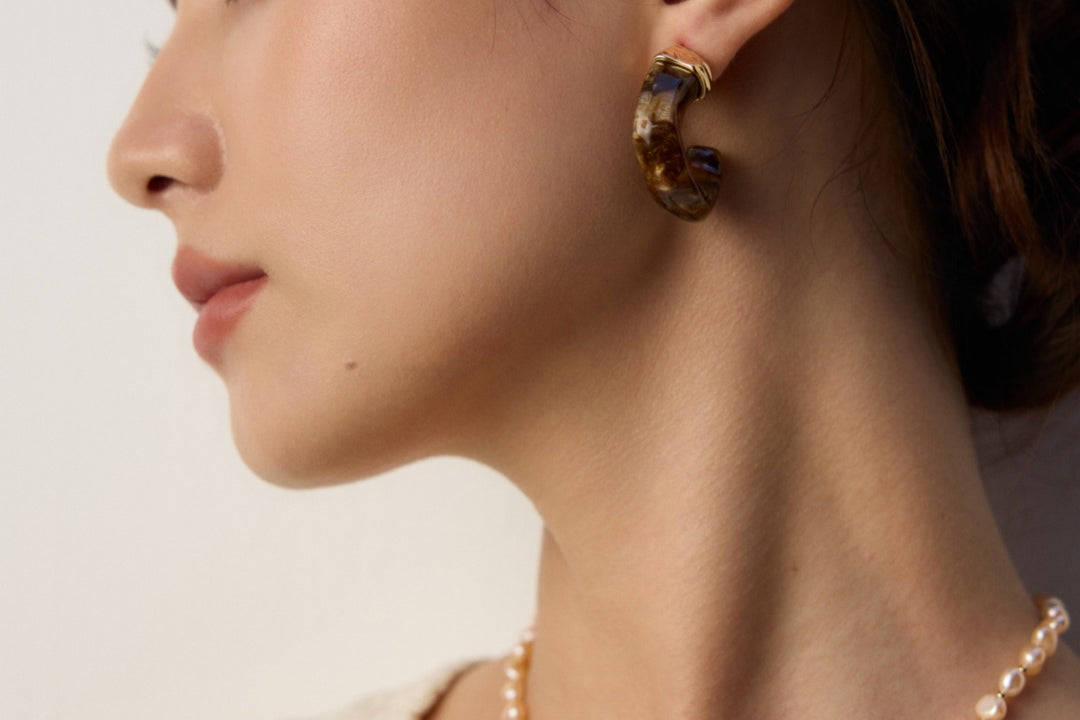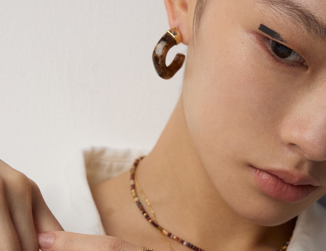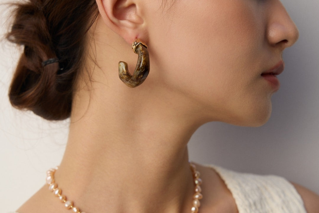 The earrings masterfully blend poetic natural imagery with clean architectural lines. The swirling patterns of imitation moss agate recall ancient landscape paintings, while the wood-like texture of simulated sea willow adds depth and warmth. This sophisticated combination creates a piece that feels both timeless and distinctly modern.