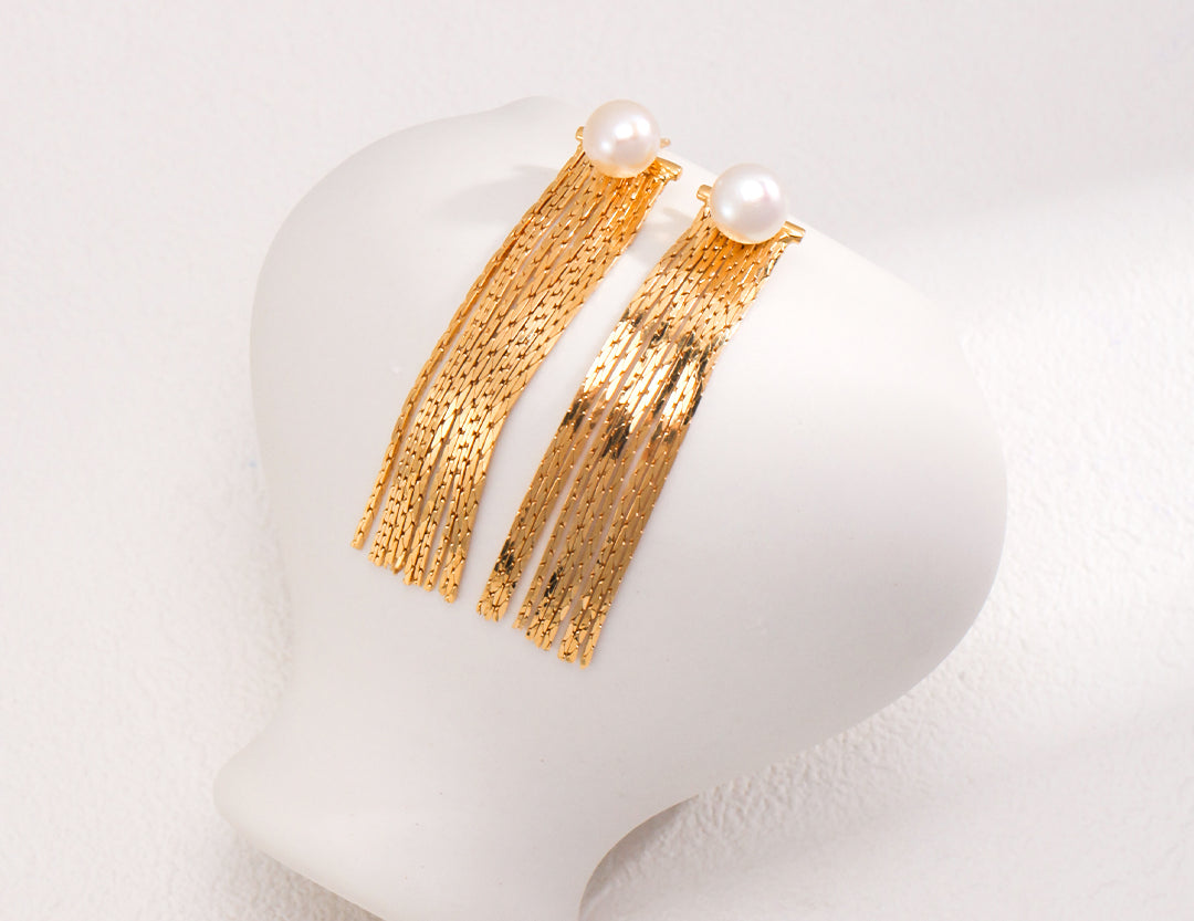 Crafted from hypoallergenic pure silver, each earring features a shimmering, multi-strand tassel that sways gently with your every move, creating an captivating play of light and motion. Suspended elegantly above the flowing tassel is a smooth, radiant pearl, offering a perfect counterpoint of calm, classic beauty. This harmonious blend of motion and stillness makes these earrings a statement of refined, dynamic femininity.