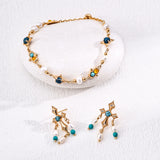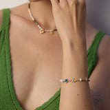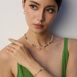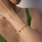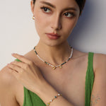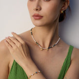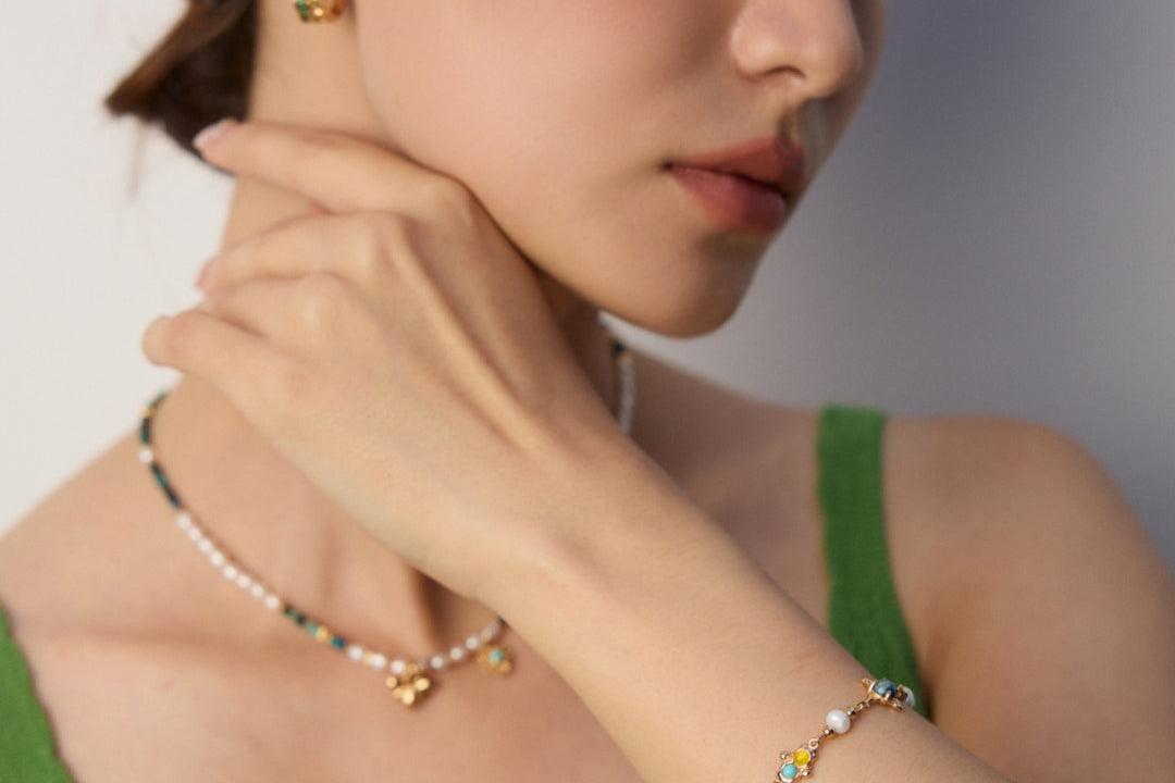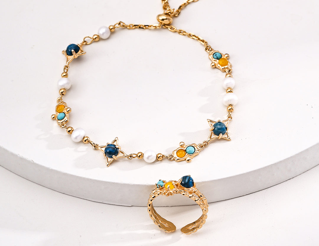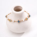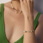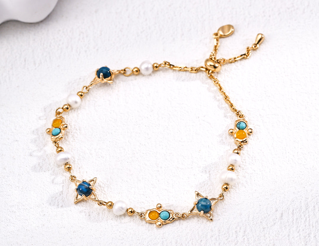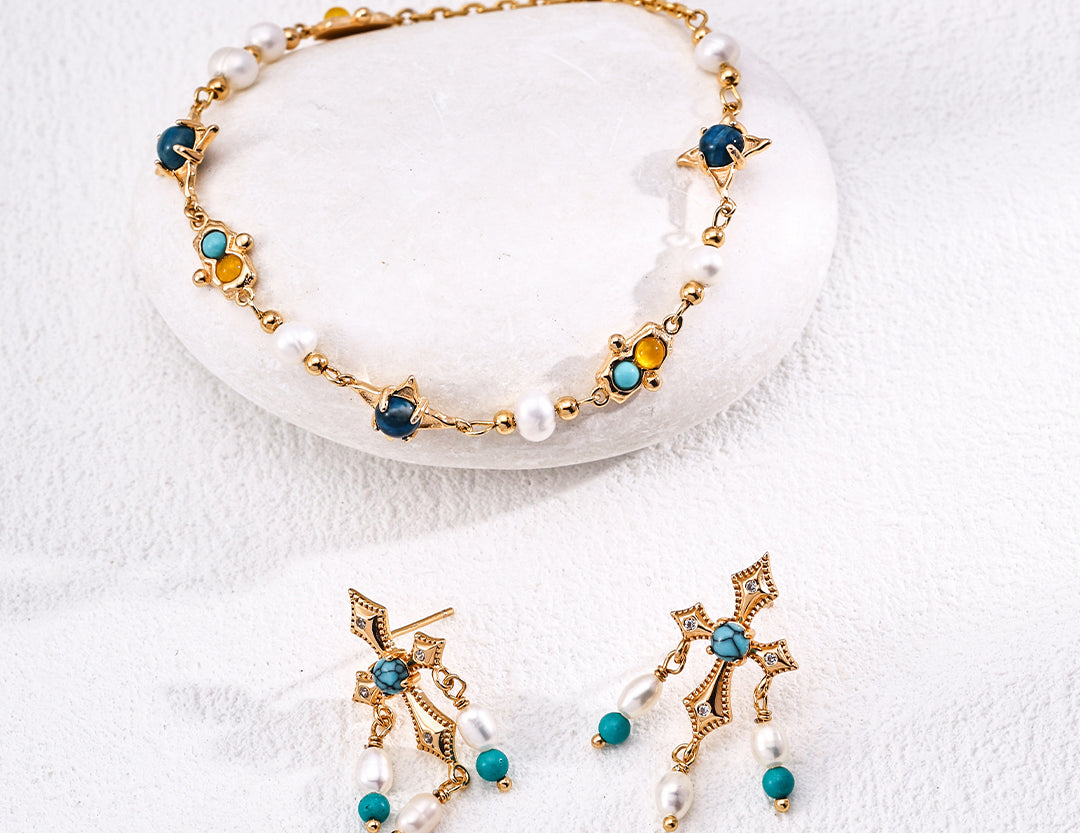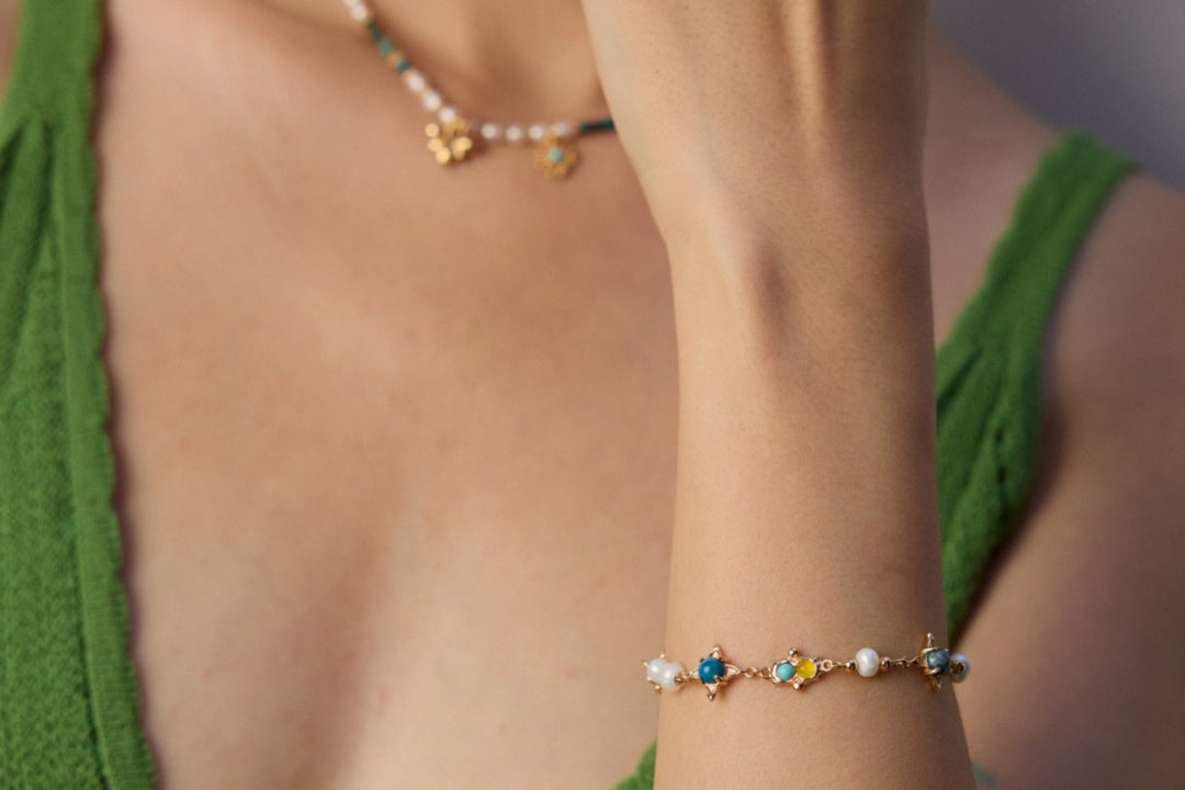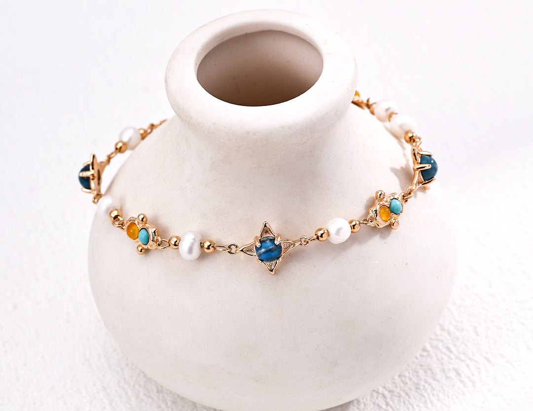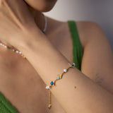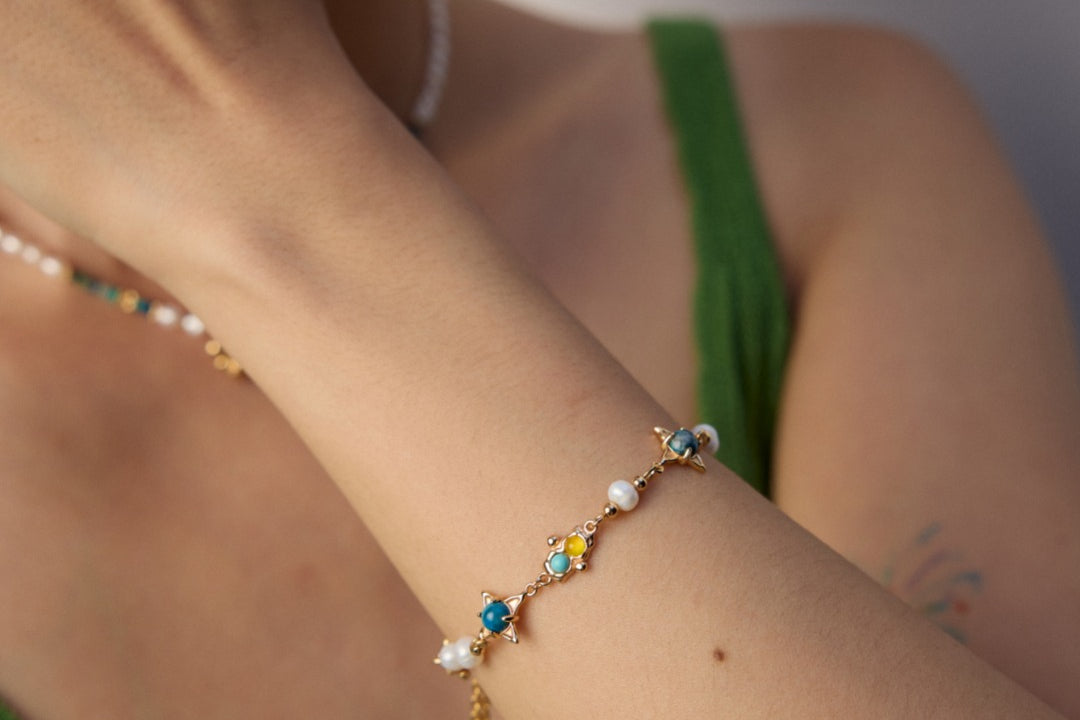 A tapestry of earth and ocean. This bracelet combines the organic beauty of natural pearls, turquoise, and agate for a uniquely vintage charm.