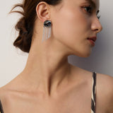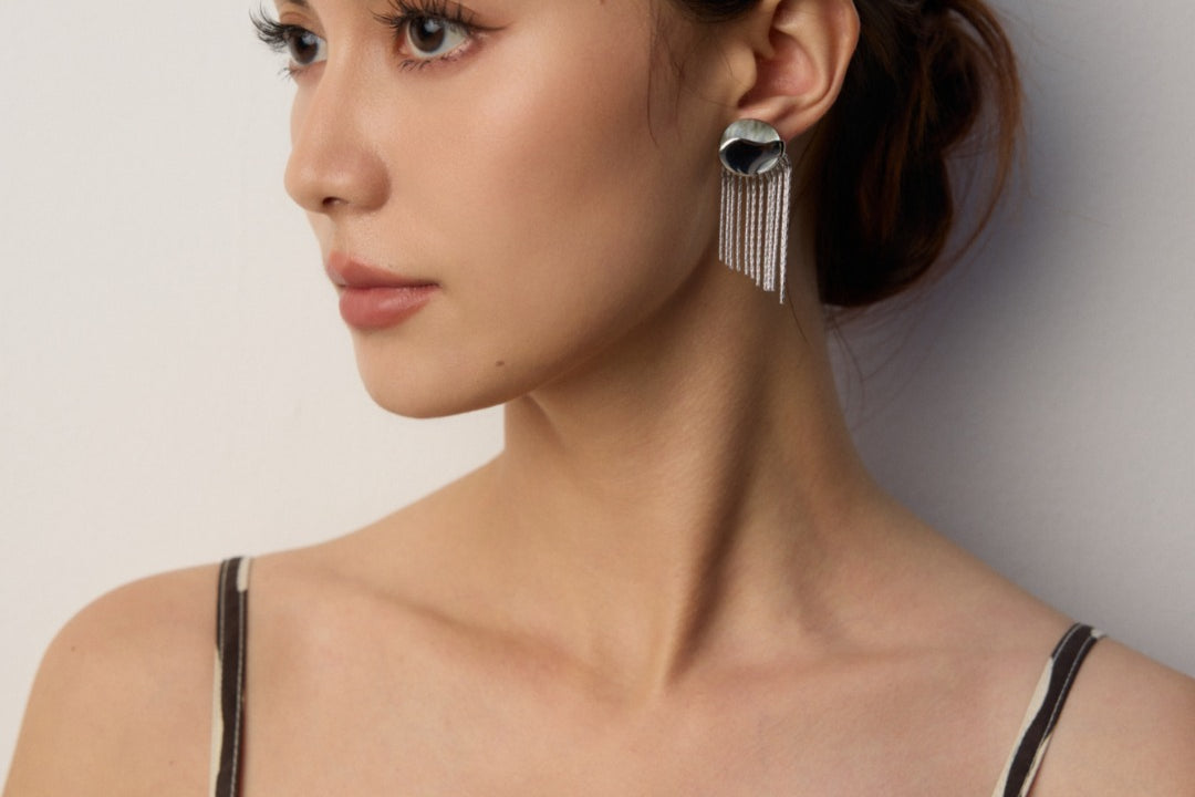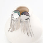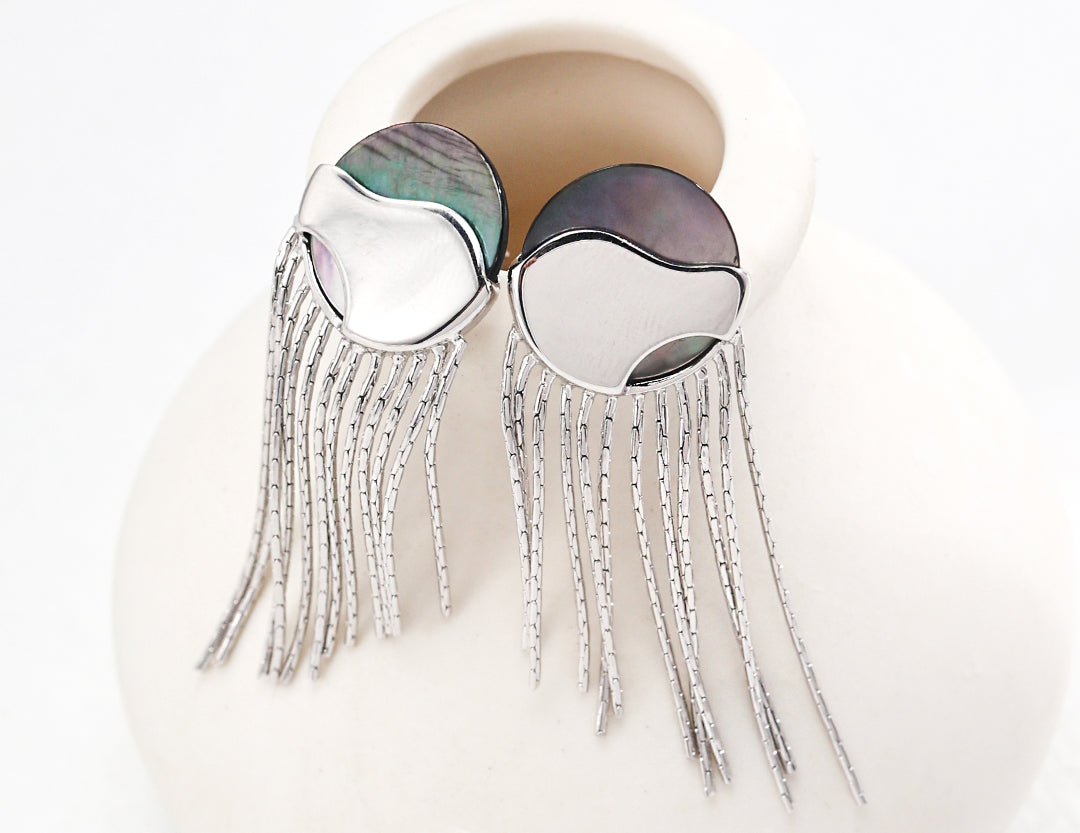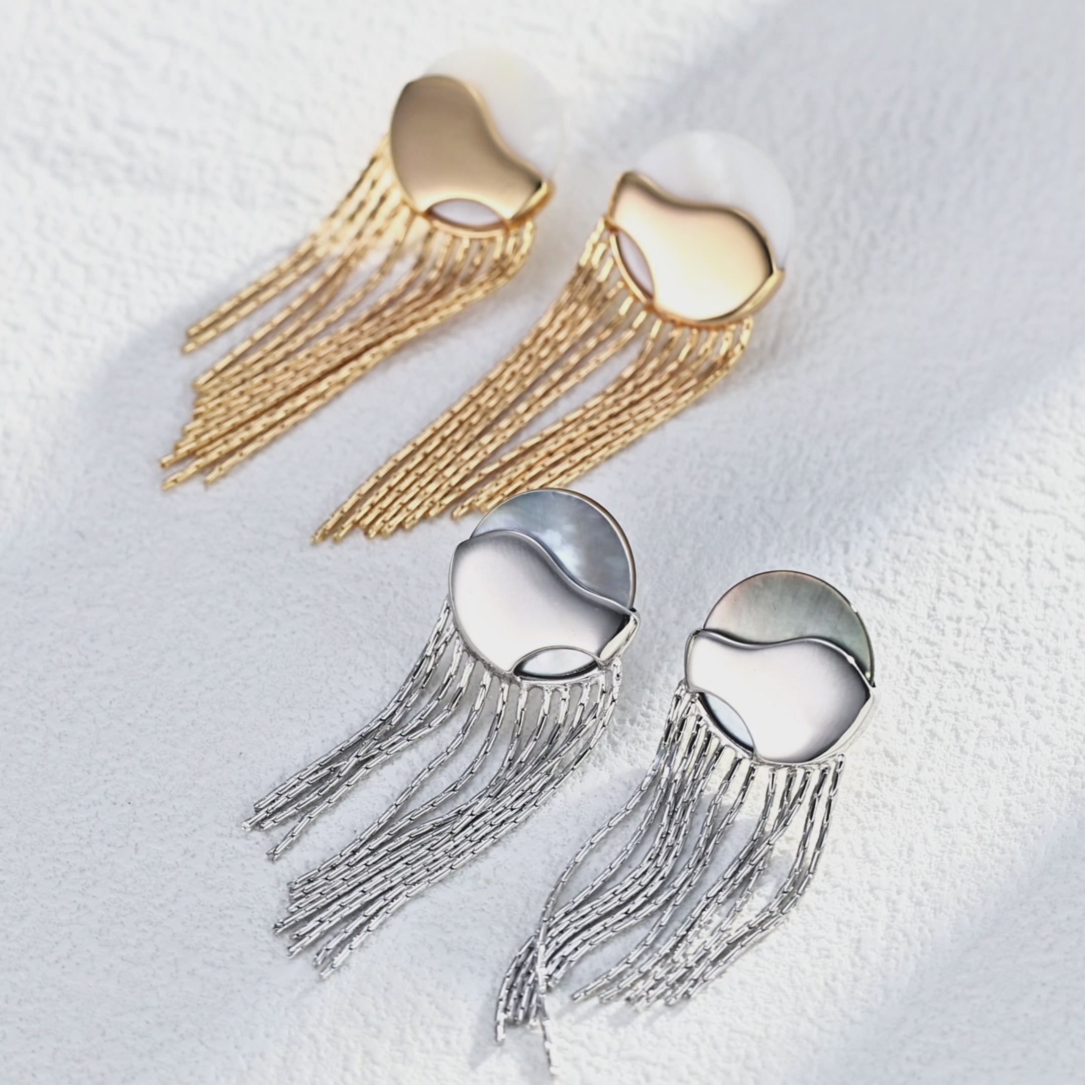 Description: Effortless coastal elegance. These sleek dangle earrings combine luminous mother-of-pearl and dark shell in a refined, versatile design that moves with understated grace.